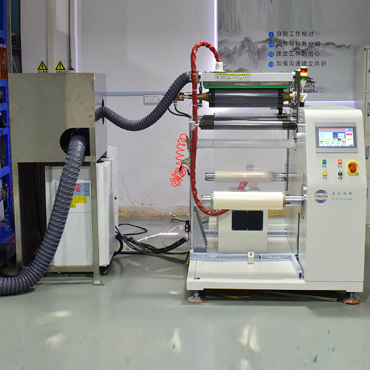 將高壓高頻電流施加于水平放置的放電電極上,在電極之間產生細小密集的藍紫色火花使空氣電離,這些空氣電離產生的等離子體在強電場的作用下加速并沖擊被處理PET的聚合物表面,而等離子體粒子的能量可以誘導化學鍵斷裂和聚合物表面的分子降解,在表面分子鏈上形成羰基和含氮的極性基團,使被材料的表面張力明顯增加,而材料表面因強離子沖擊而粗化;協同效應使被處理材料的粘附性明顯改善,同時實現對PET材料進行等離子表面活化和處理,提高PET的表面能和浸潤能力、粘貼性。